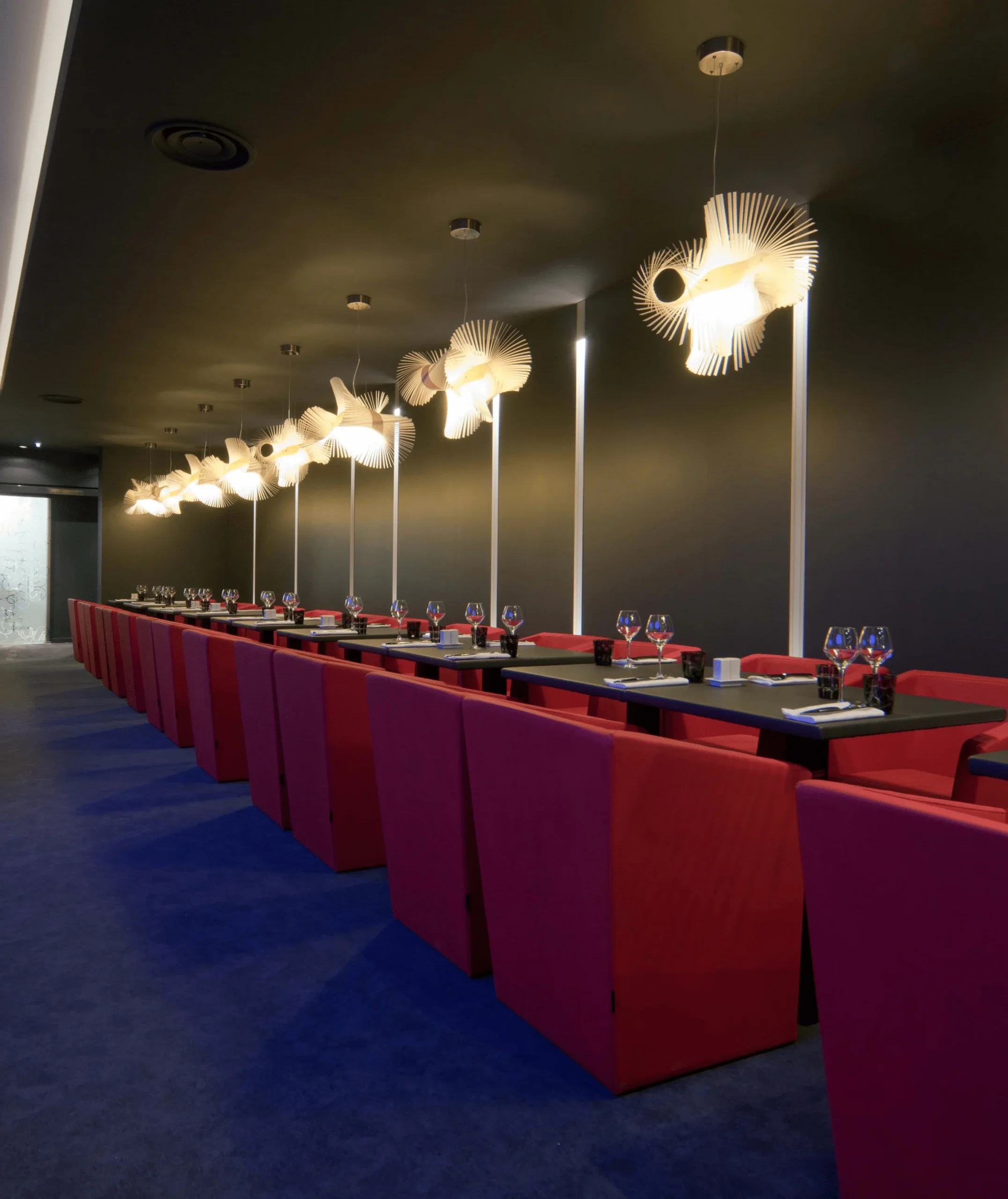 L’aménagement a été conçu pour mettre en valeur la cuisine simple et sophistiquée du chef, en offrant un espace où chaque visite propose une expérience différente grâce à la diversité des assises et des ambiances.