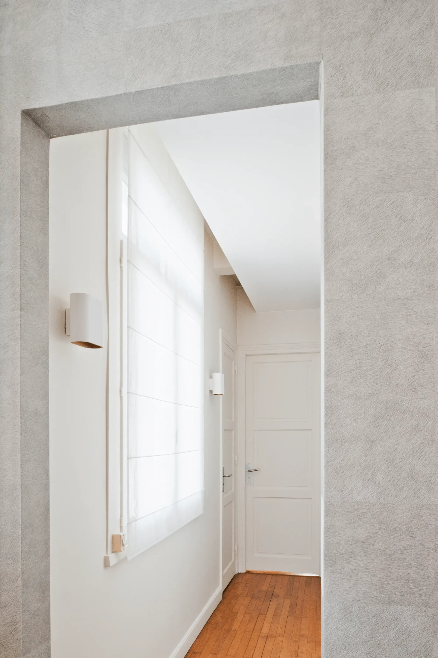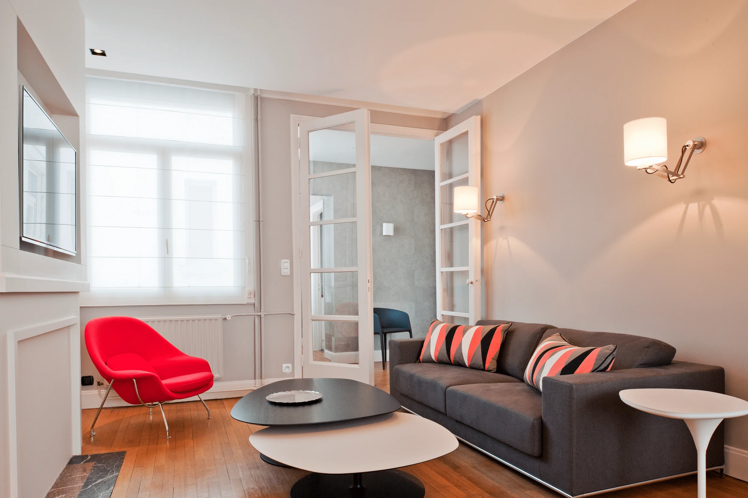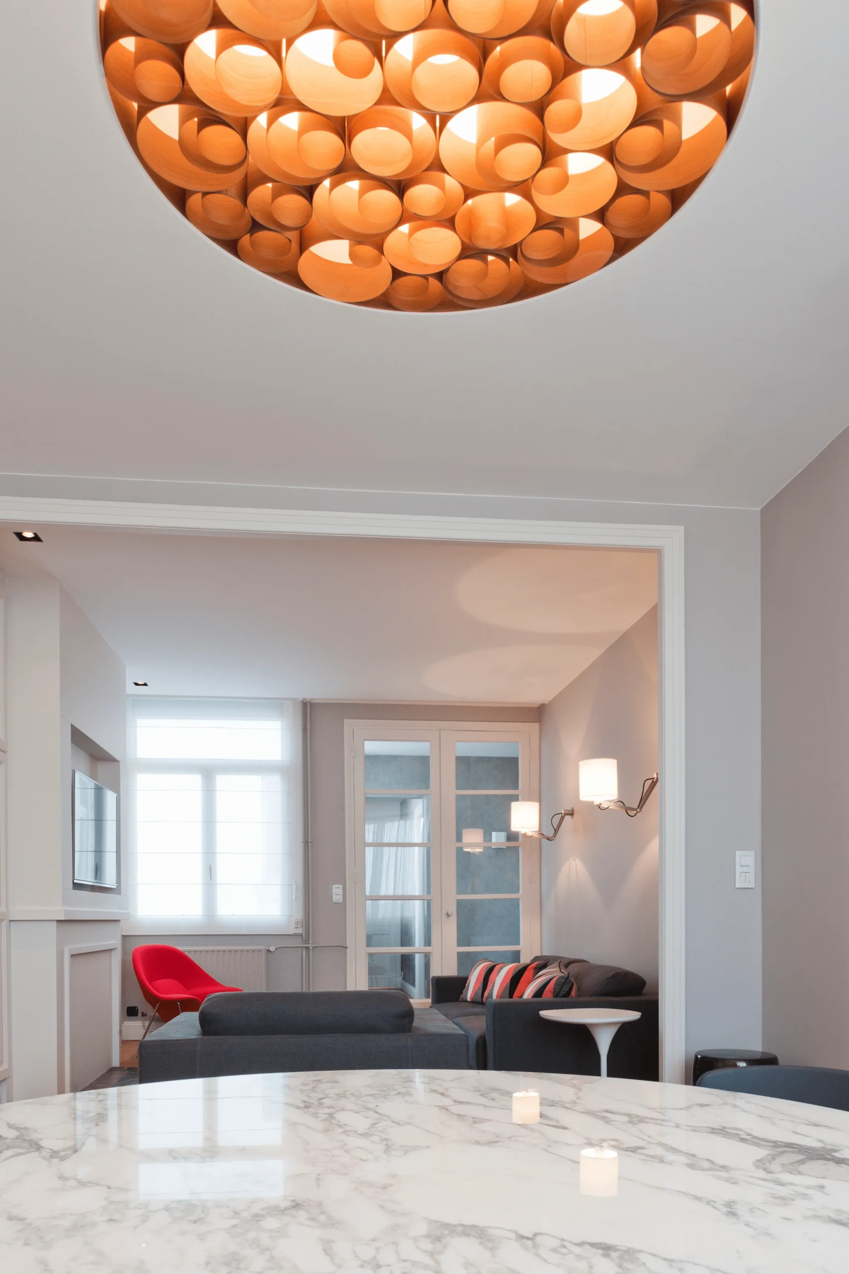 Le projet inclut la conservation du parquet existant, la création d’un faux plafond en placo, ainsi que le remaniement de l’éclairage et de l’installation électrique, afin de moderniser l’appartement tout en préservant son caractère original.
